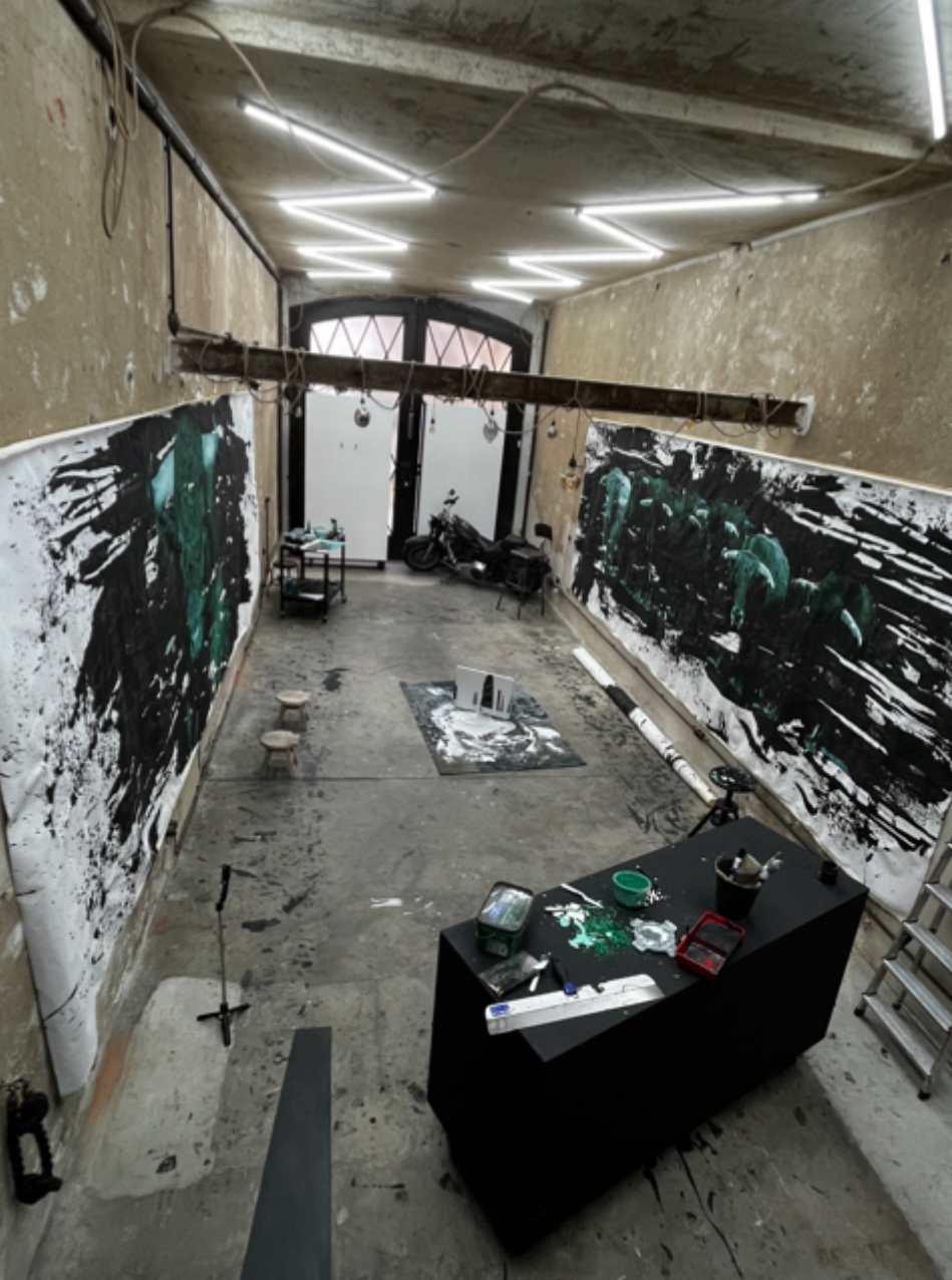 Der erste Tag widmet sich der Einführung in die künstlerische Technik und Denkweise von Emilio Fornieles. Hier entsteht das Fundament: Sie lernen, Chaos bewusst zuzulassen – und gestalterisch zu ordnen. Es werden die theoretischen Grundlagen des figurativen Expressionismus gezeigt, erste praktische Übungen durchgeführt, wie die Entwicklung monochromer Farbverläufe (Schwarz-Weiß). Anschließend wir das individuelle Bildformat vorbereitet.